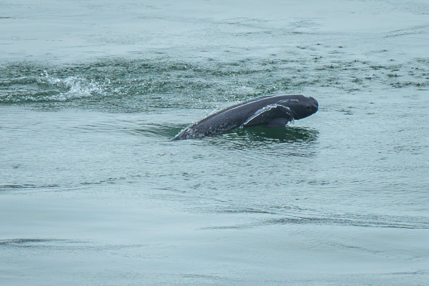 长江江豚在湖北省宜昌市葛洲坝下游水域逐浪嬉戏(2024年5月21日摄)。新华社记者 肖艺九 摄