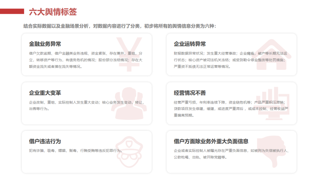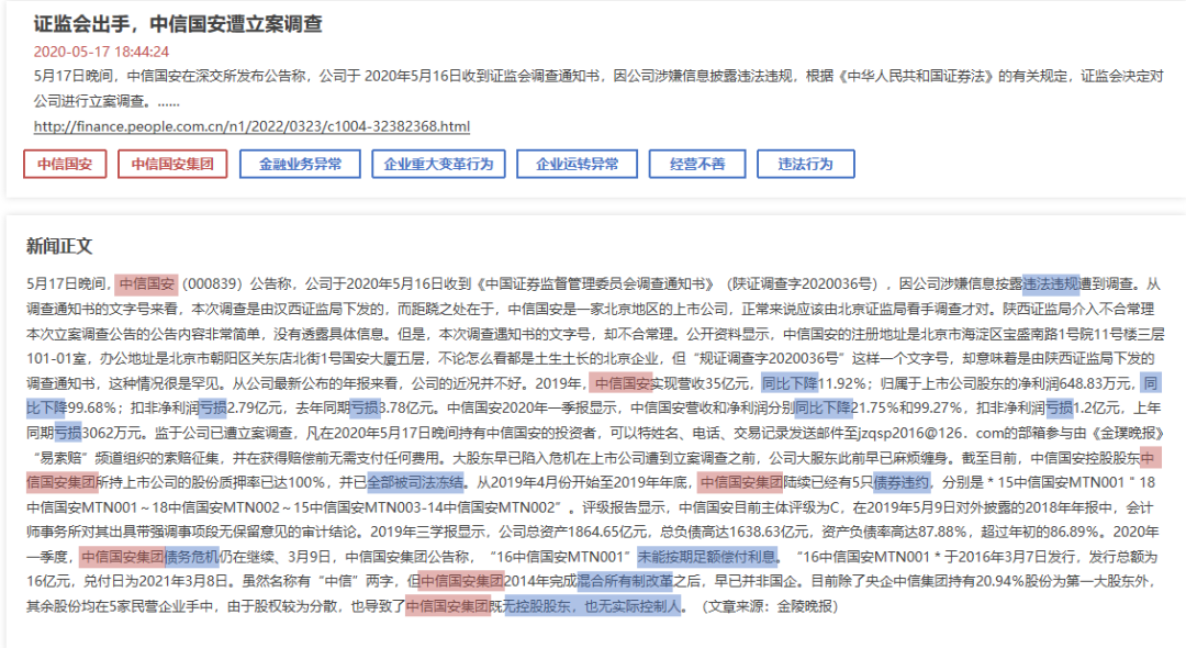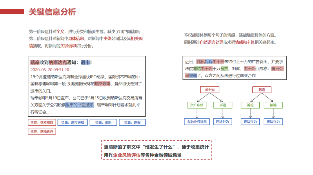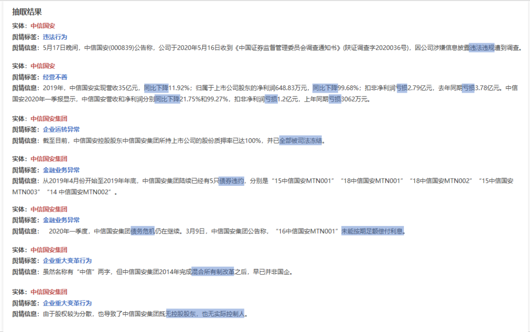 • 关键信息分析:识别新闻中的主体公司、风险事件和负面信息,并进行详细分类,例如金融业务异常、企业运转异常、企业重大变革等。